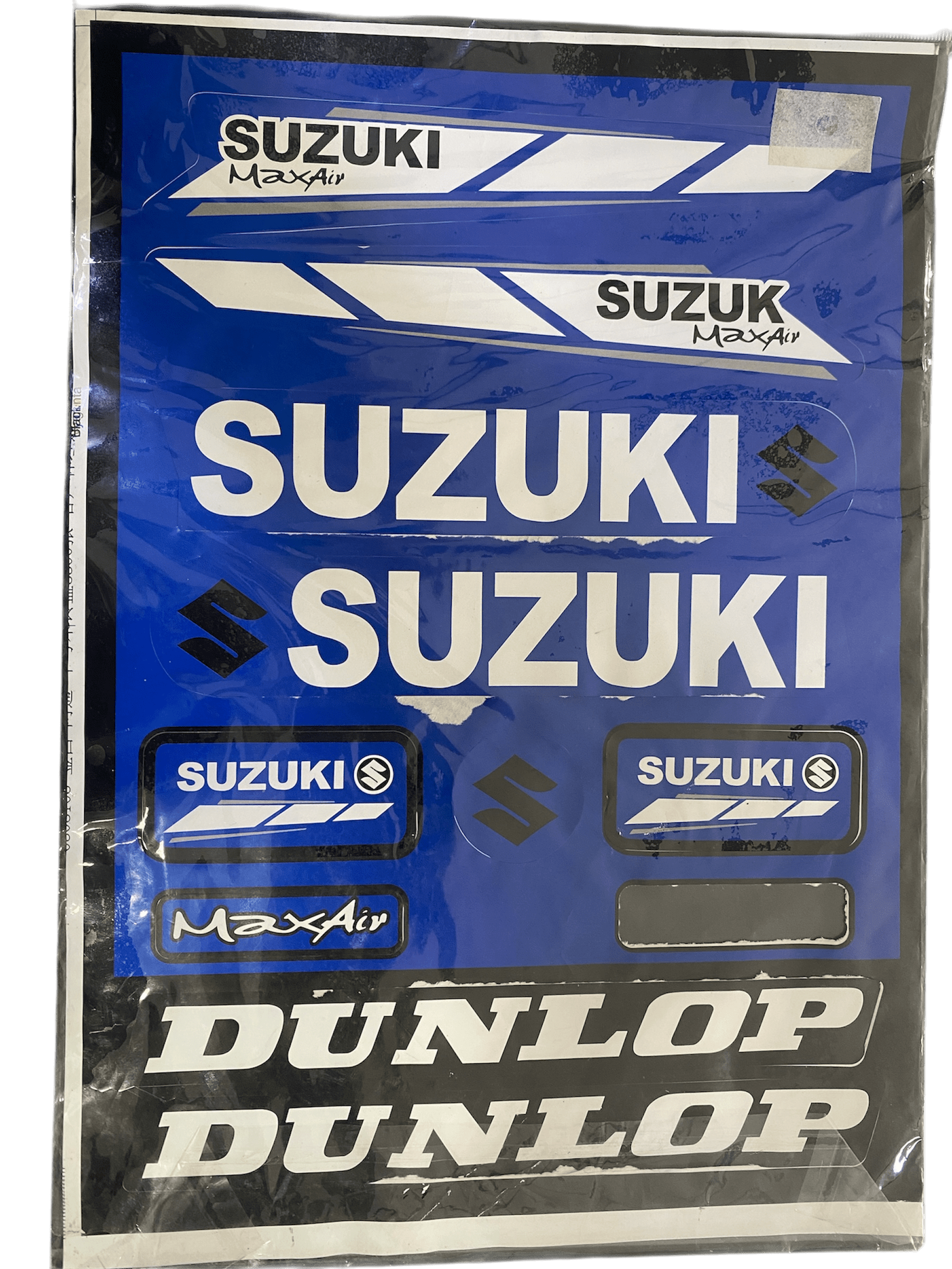 Stickers Suzuki — planche d’autocollants affichant logos et motifs Suzuki, adaptée pour motos, casques et accessoires. Vinyle durable et résistant aux intempéries, avec adhésif puissant pour une application facile et tenue longue durée.